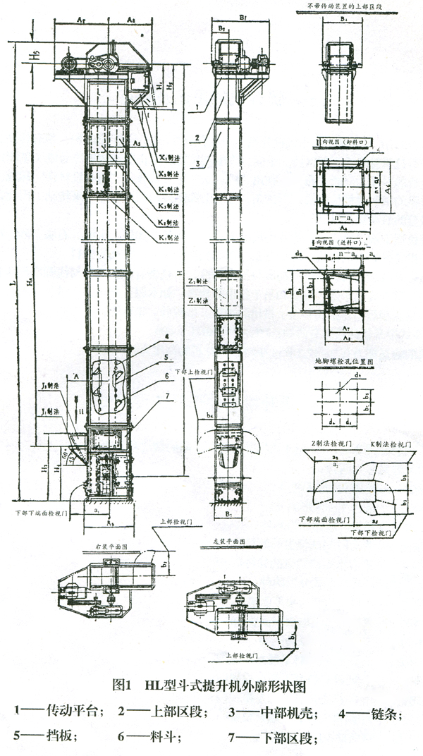 針對不同的使用要求,HL型斗式提升機具有不同的制法和裝法: